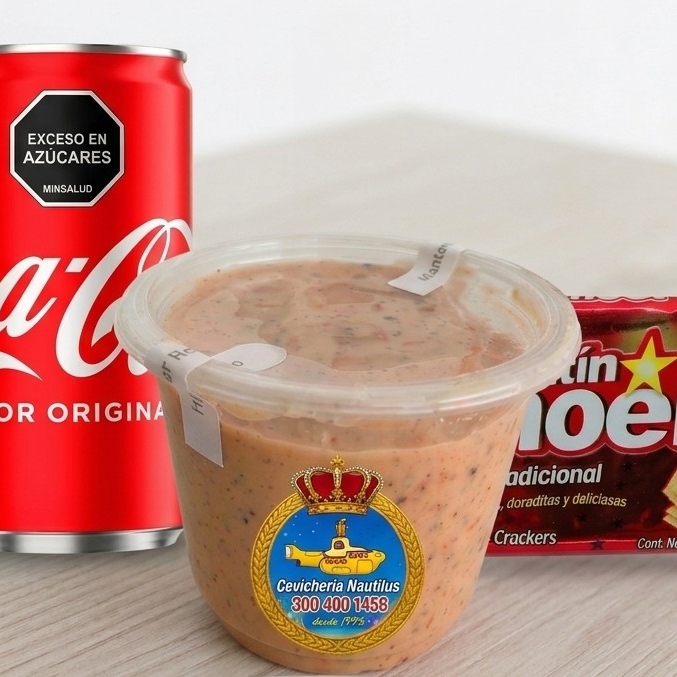 vaso 9 (onzas) camaron, cebolla, limon, salsa tomate, salsa mayonesa, coca-cola 235ml , galletas saltina, menta helada