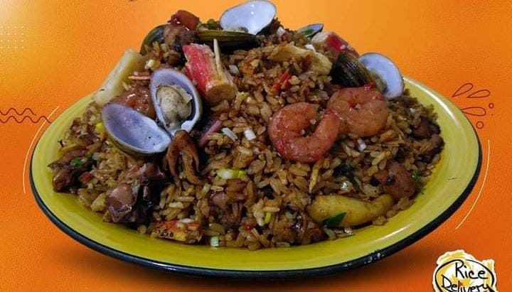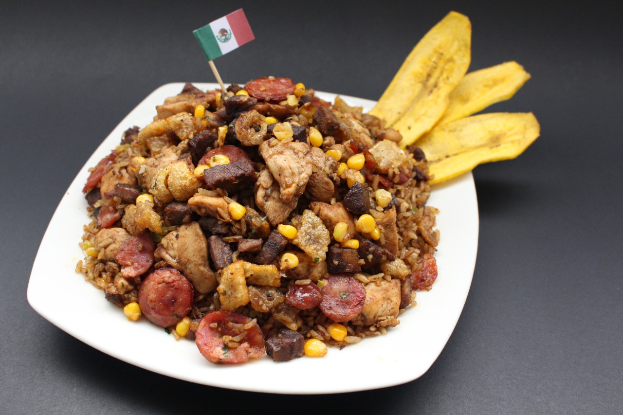 1100gr de arroz con Carne de cerdo, res, pollo, chicharrón, chorizo ahumado, maduro y caraota.