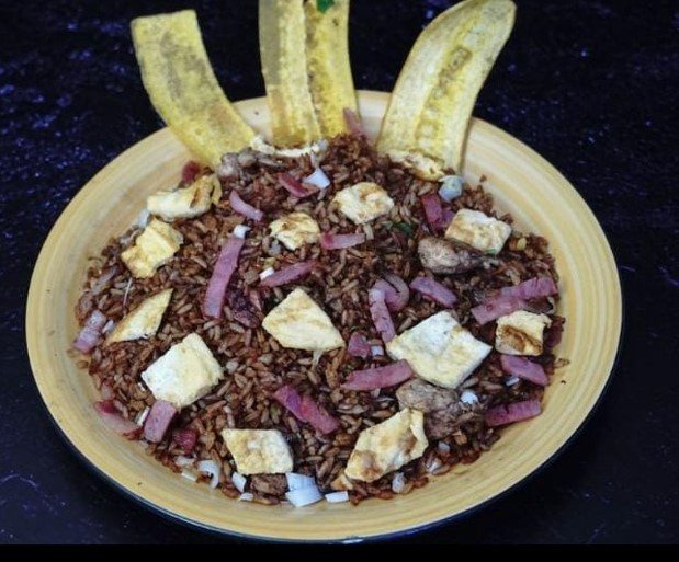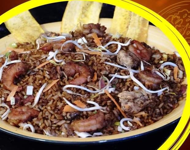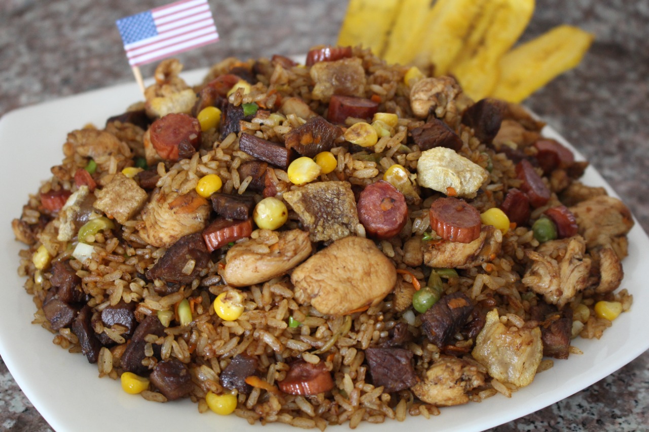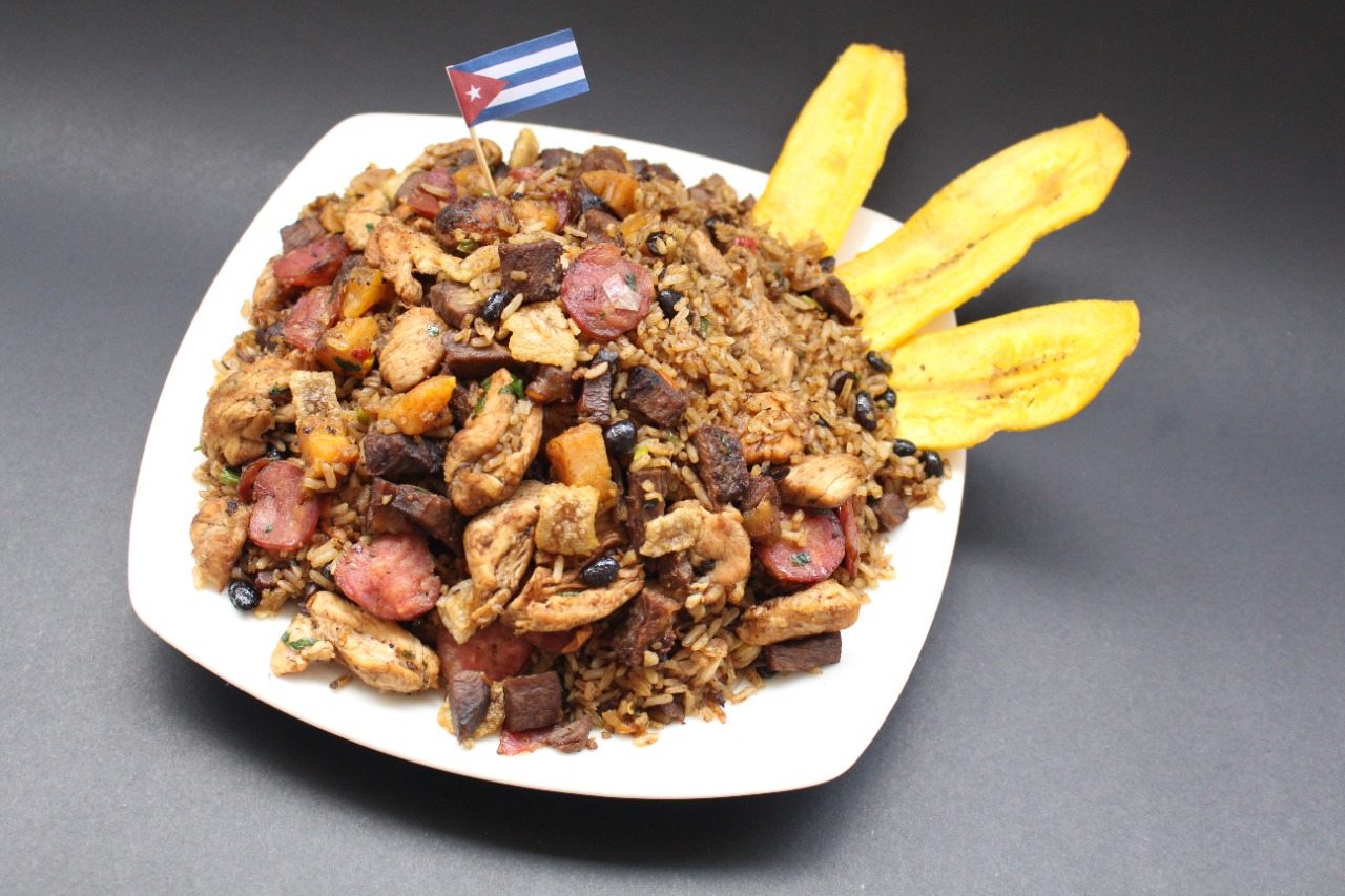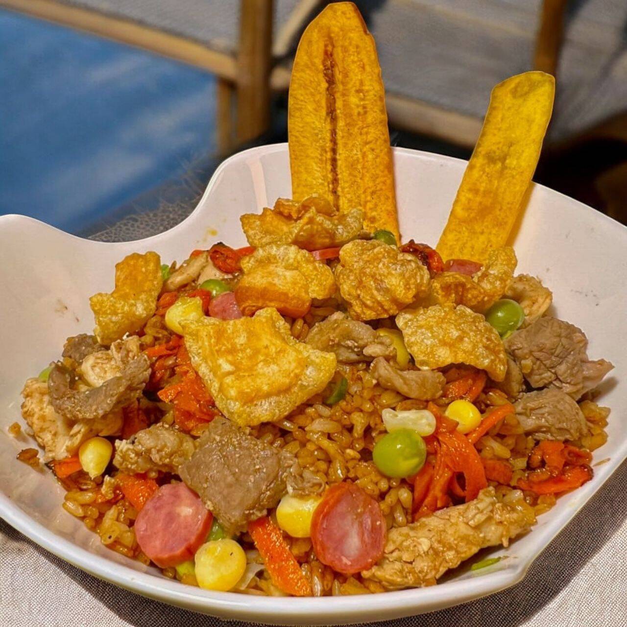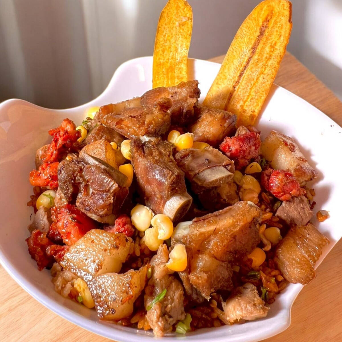1400gr de arroz con Carne de cerdo, res, pollo, chicharrón, chorizo ahumado, maduro y caraota.
