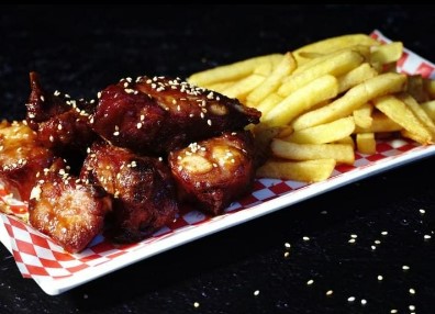 Opciones de salsa (BBQ, miel mostaza, búfalo), 500 g, 250 g papa francesa, picante al gusto.