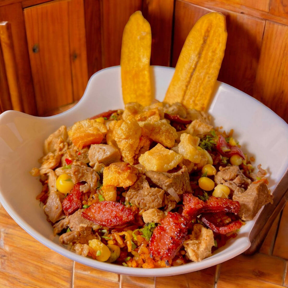 1400gr de arroz con Carne de cerdo, res, pollo, chicharrón, chorizo ahumado y maíz (picante al gusto).