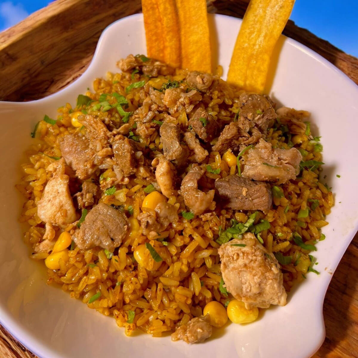 1100gr de arroz con Carne de cerdo, res, pollo, chicharrón, chorizo ahumado y maíz (picante al gusto).