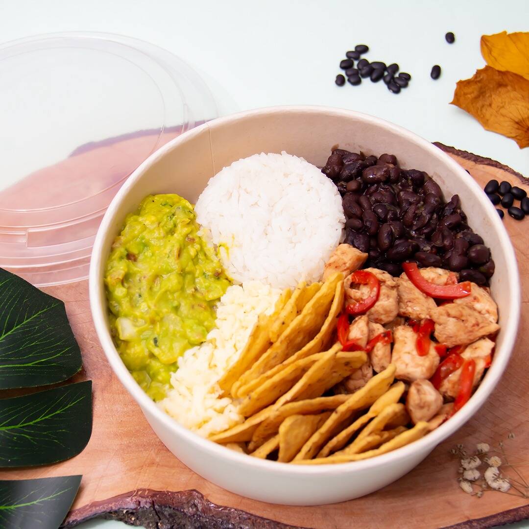 Fajita de res o pollo, arroz blanco, frijol negro, nachos, queso y guacamole.