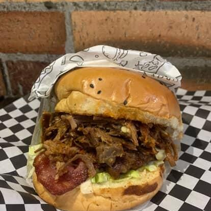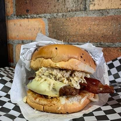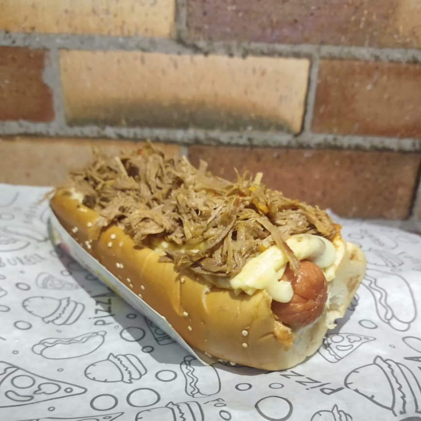 Salchicha americana, papa ripio, tocineta, sobrebarriga desmechada, queso gratinado, pan brioche y porción de papas.