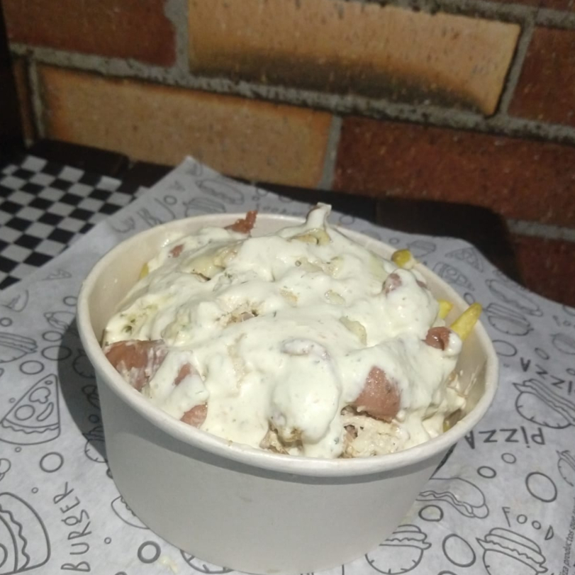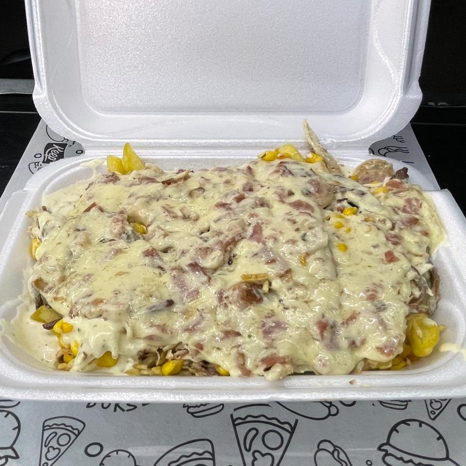 Papas fritas, sobrebarriga desmechada, pollo desmechado en salsa tártara, tocineta, papa ripio, vegetales y queso gratinado.