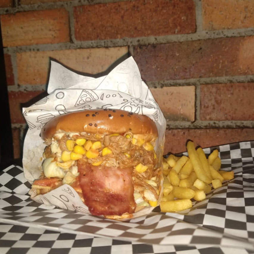 Salchicha americana, papa ripio, tocineta, sobrebarriga desmechada, pollo desmechado en salsa tártara, queso gratinado, pan brioche y porción de papas.