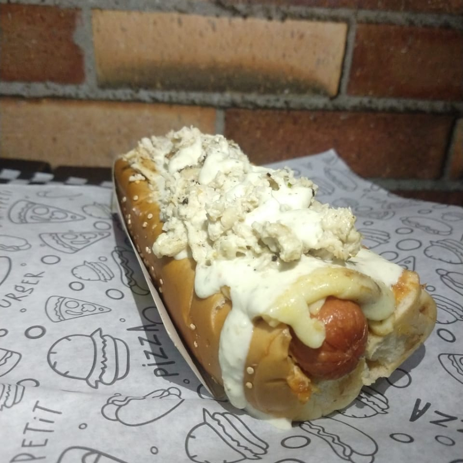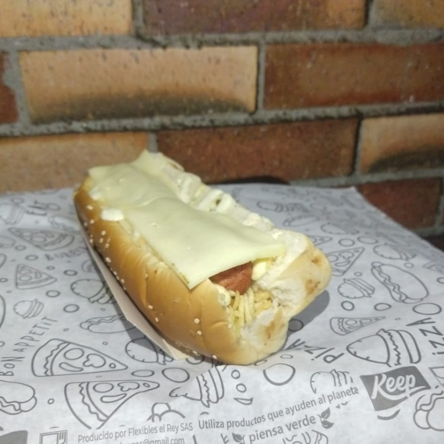 Salchicha americana, papa ripio, tocineta, pollo desmechado en salsa tártara, queso gratinado, pan brioche y porción de papas.