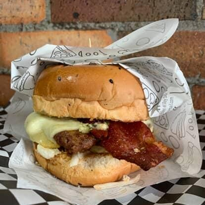 Hamburguesa clásica: vegetales en salsa grillé, carne de res, tocineta, queso, papa ripio, pan brioche y papas fritas.