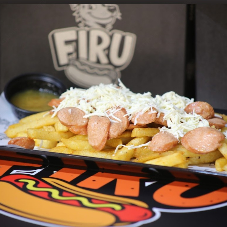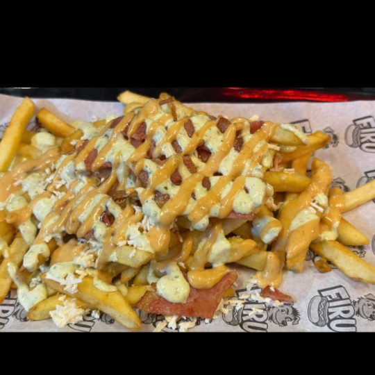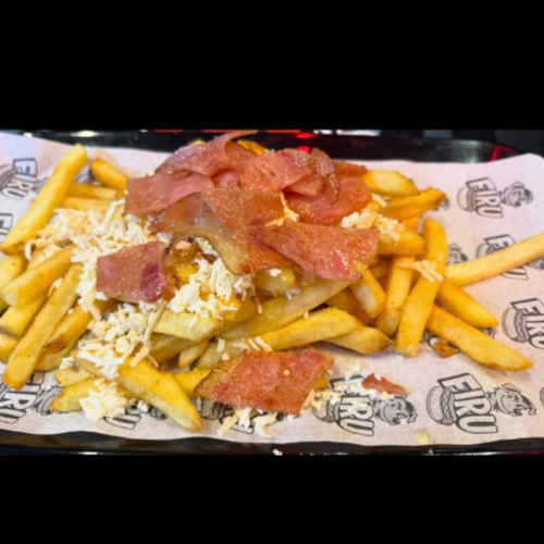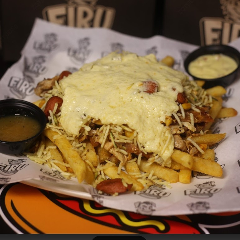 Papas, salchicha, pollo desmechado, cubitos de carne de res, maíz, papas fosforito, tocineta, queso mozzarella y salsas.