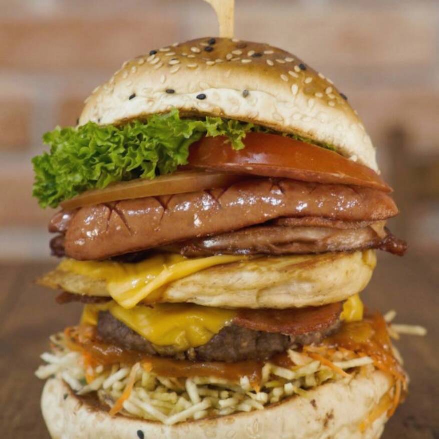 Carne de res artesanal 120 g, pechuga de pollo, lomo de cerdo ahumado,chorizo, tocineta, queso americano, queso mozzarella, cebolla caramelizada, ensalada coleslaw, lechuga fresca, tomate, papas crocantes, salsa triple XXX y pan brioche.