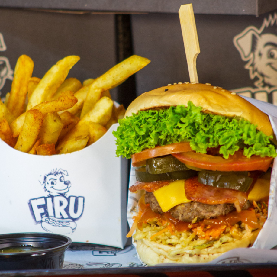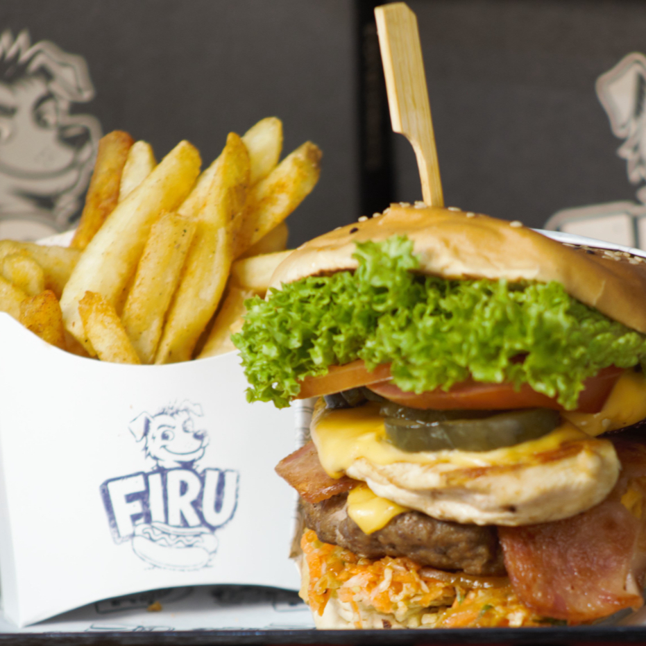 Carne de res artesanal 120 g, cebolla caramelizada, ensalada coleslaw, pepinillos, lechuga fresca, tomate, papas crocantes, tocineta, salsa triple XXX, queso americano y pan artesanal.