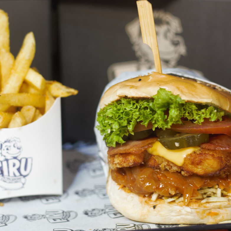 Pechuga de pollo apanada doradita, cebolla caramelizada, ensalada coleslaw, lechuga fresca, tomate, papas crocantes, tocineta, salsa triple XXX, queso americano y pan artesanal.
