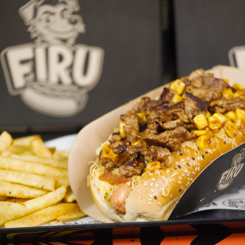 Pan brioche artesanal, salchicha americana, tocineta ahumada, mix de cubitos de lomo de res y pollo maíz, papas crocantes, salsa triple XXX y tártara.