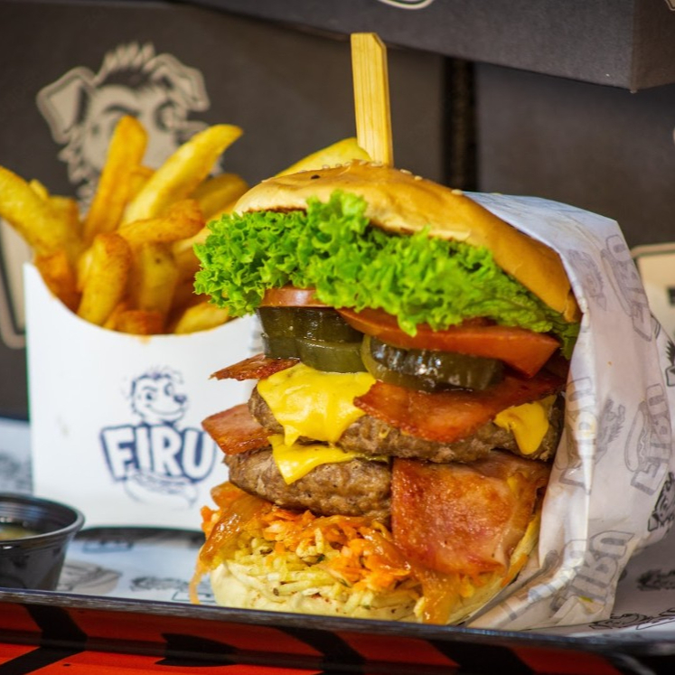 Doble carne de res artesanal 120 g c/u, doble tocineta, doble queso americano, cebolla caramelizada, ensalada coleslaw, pepinillos, lechuga fresca, tomate, papas crocantes, salsa triple XXX y pan brioche.