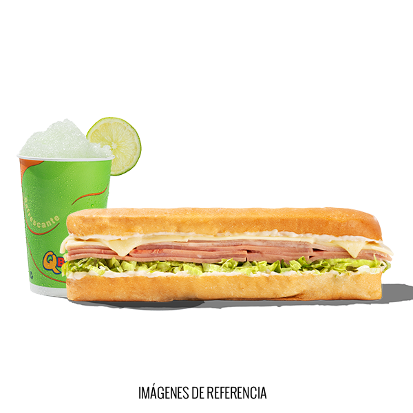 Mix de jamones (res y cerdo), queso mozzarella, lechuga batavia y salsa Qbano, papas y bebida.