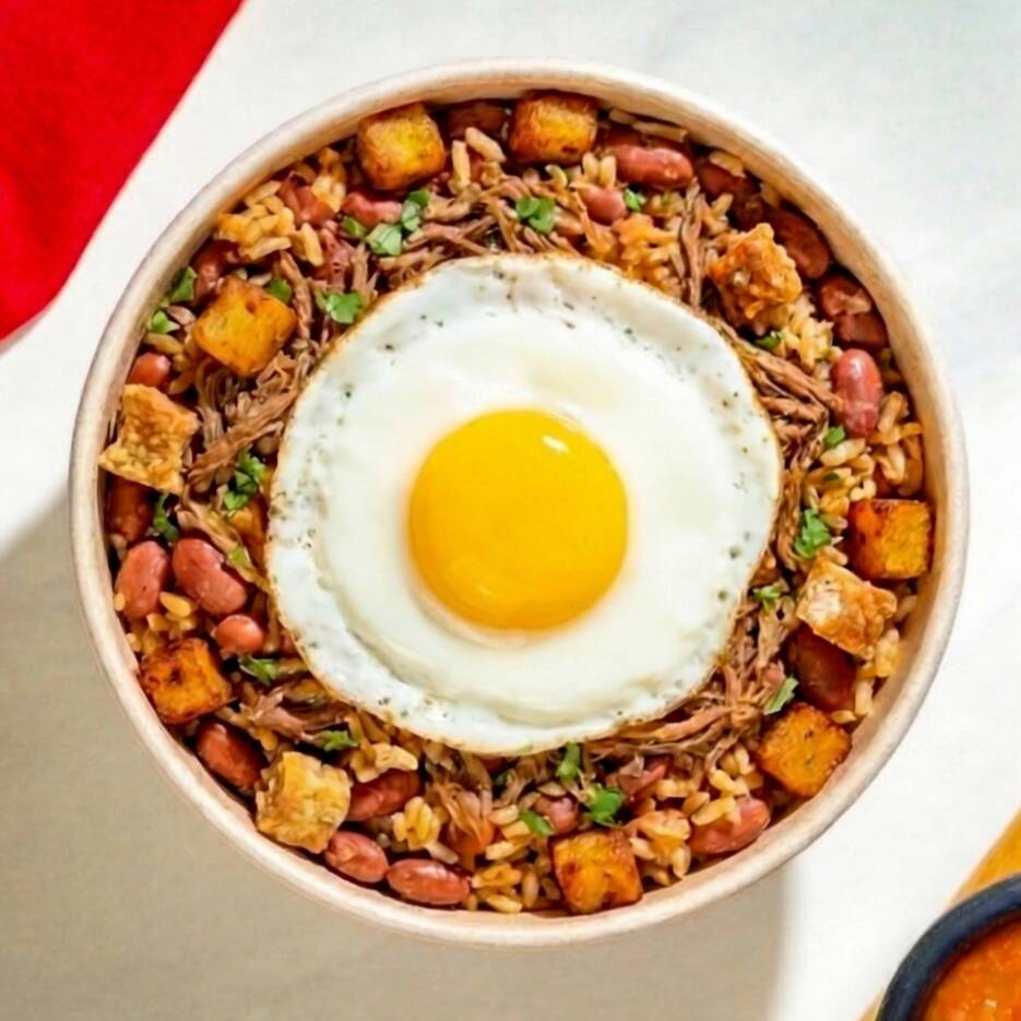 Calentado a base de frijoles, maduro, carne mechada, salsa criolla y el arroz, servidos con huevo.