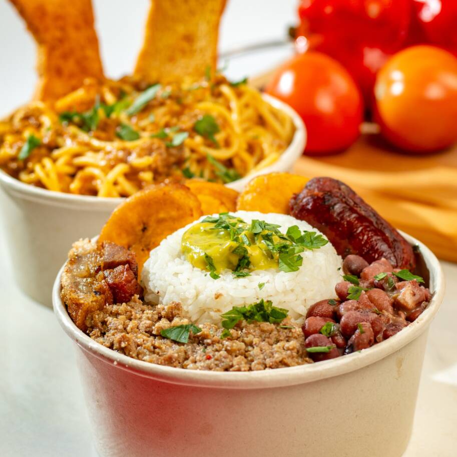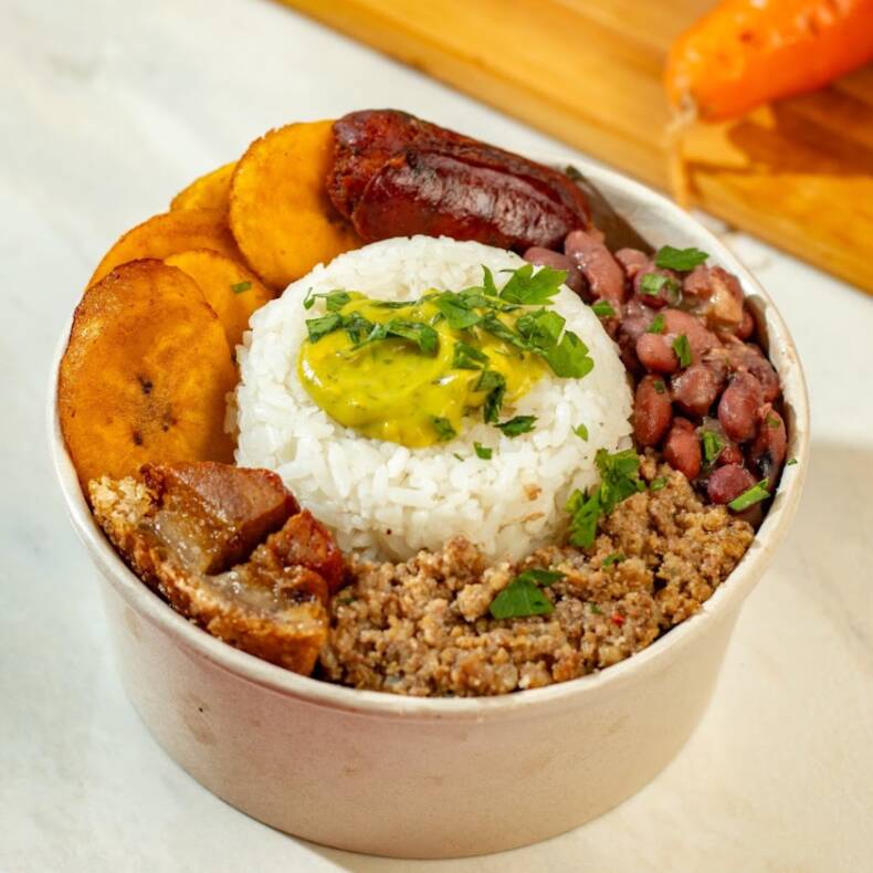 Arroz, frijol, carne de res mechada, tocineta, plátano maduro, guacamole.