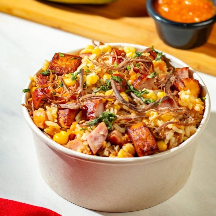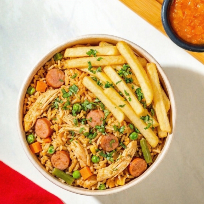 Disfruta de nuestro nuevo bowl de arroz con pollo desmechado, salchicha, alverja, habichuela y zanahoria, todo sazonado con nuestro hogao secreto de la casa y un toque de salsa de tomate. Servido con papas francesas crocantes.
