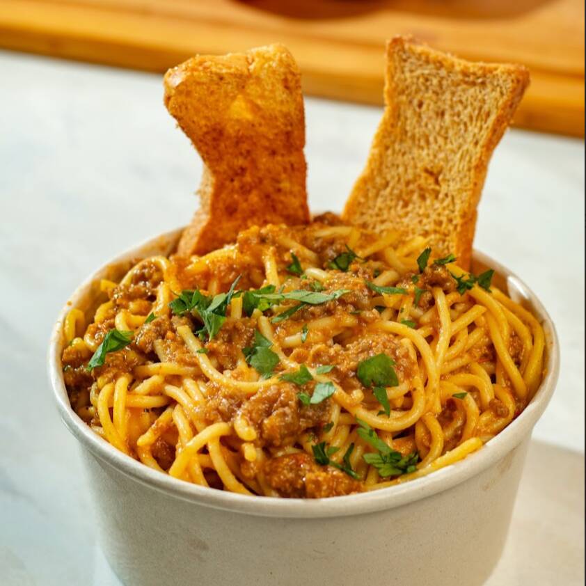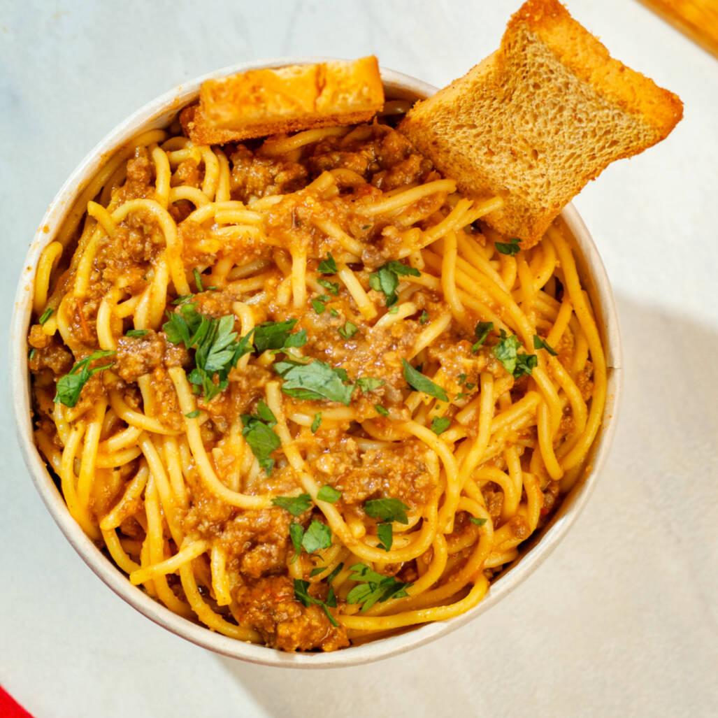 Spaguettis con carne molida y salsa bolognesa, acompañados de tostadas de ajo.