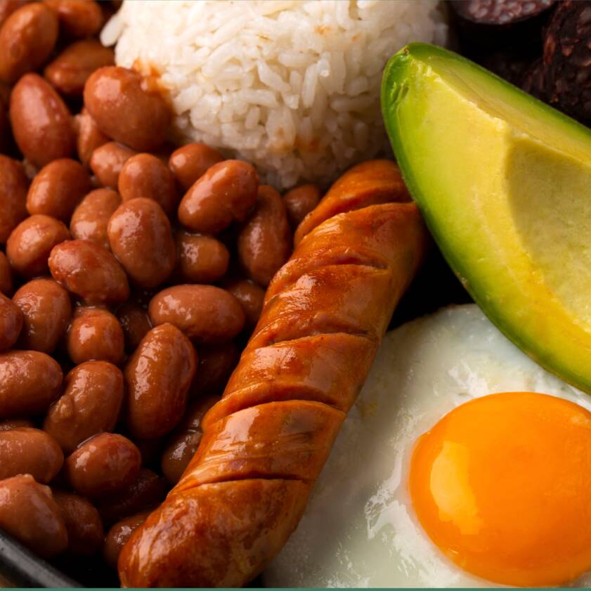 Con frijol, arroz, tajadas de plátano maduro, carne molida, chorizo, huevo y aguacate.
