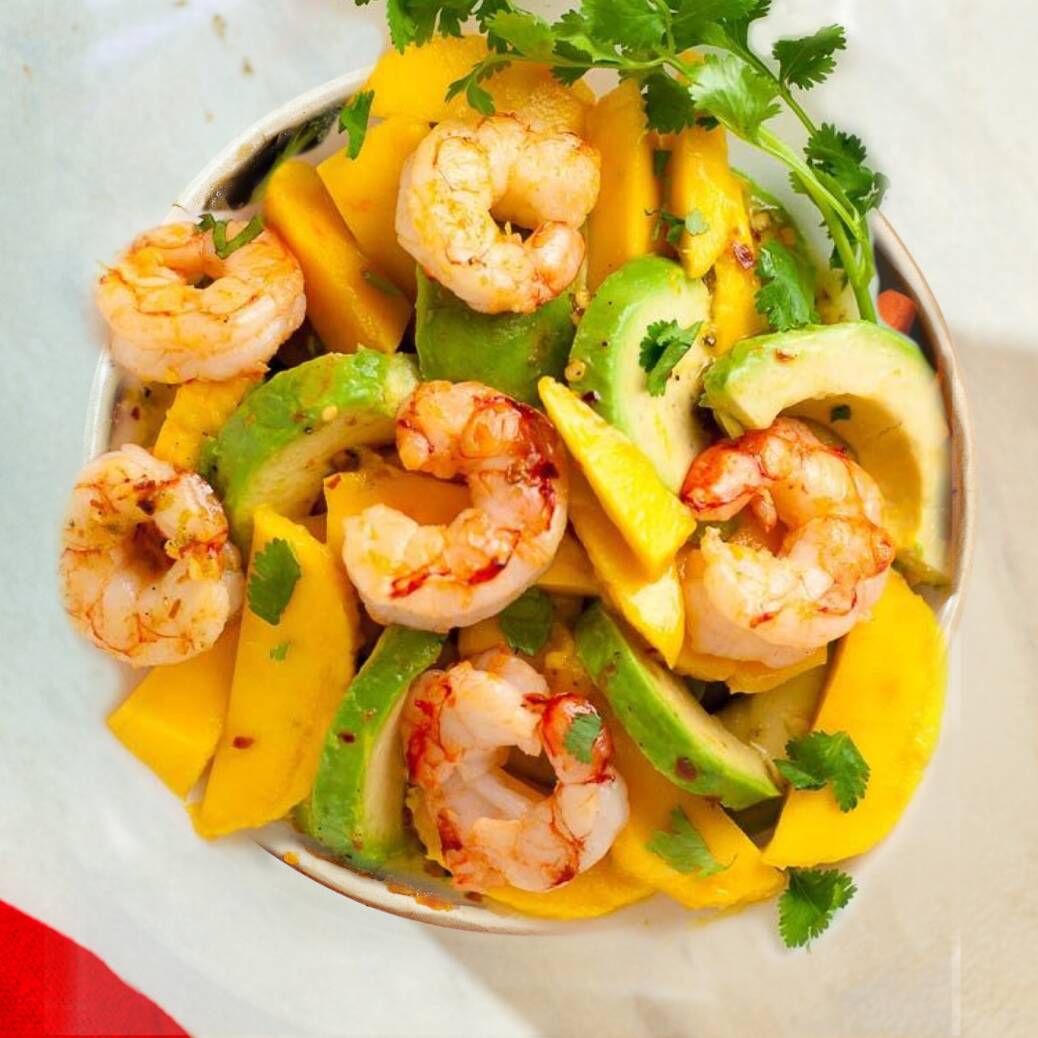 Bowl con camarones + arroz + mango + aguacate + cebolla + toque cítrico. Tropical, diferente y balanceado. ( Aprox. 581 Calorías).