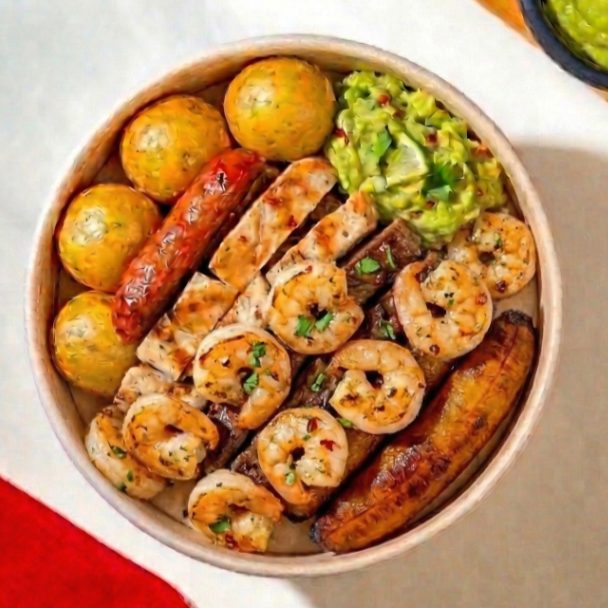 Para los que lo quieren todo: 250g de pura proteína. Lomo de res jugoso en tiras, pechuga de pollo a la plancha, mini chorizo y 8 camarones asados al punto. Acompañado de papas criollas doraditas, tajadas de plátano maduro y nuestro guacamole artesanal.