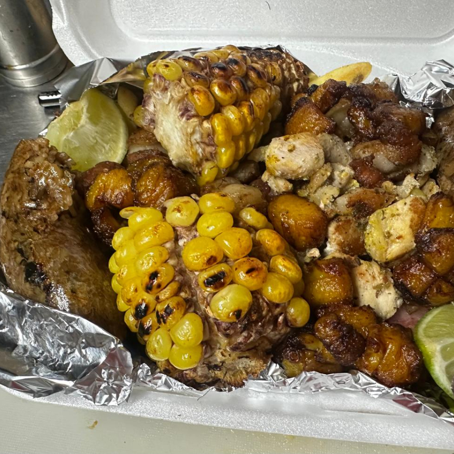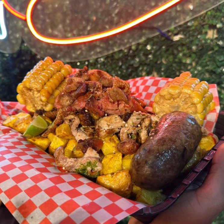 375 Gr entre cerdo y chicharrón crocante, 1 chorizo al carbón , 1 deliciosa rellena , papa amarilla, maduritos en su punto , 2 rodajas de mazorca