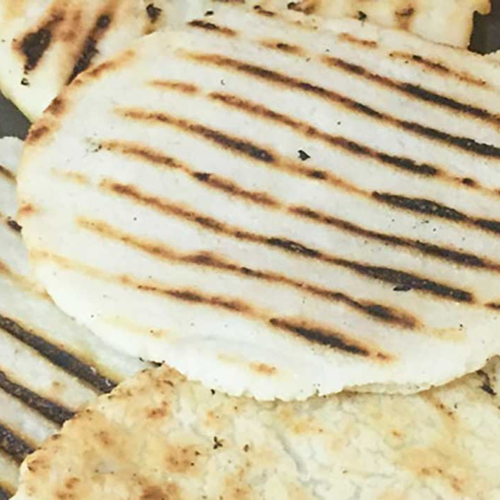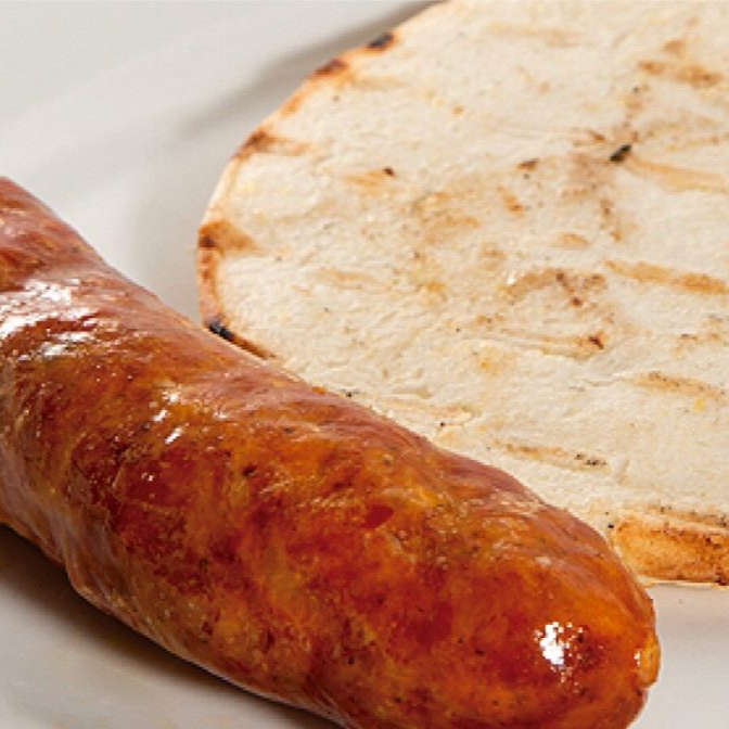Arepa delgada tipo paisa + 1 chorizo al carbón +toppings a elección