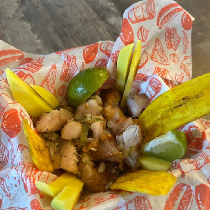 Chicharrón o chorizo de la casa aderezado, acompañado de pico de gallo, limón, mango y chifles