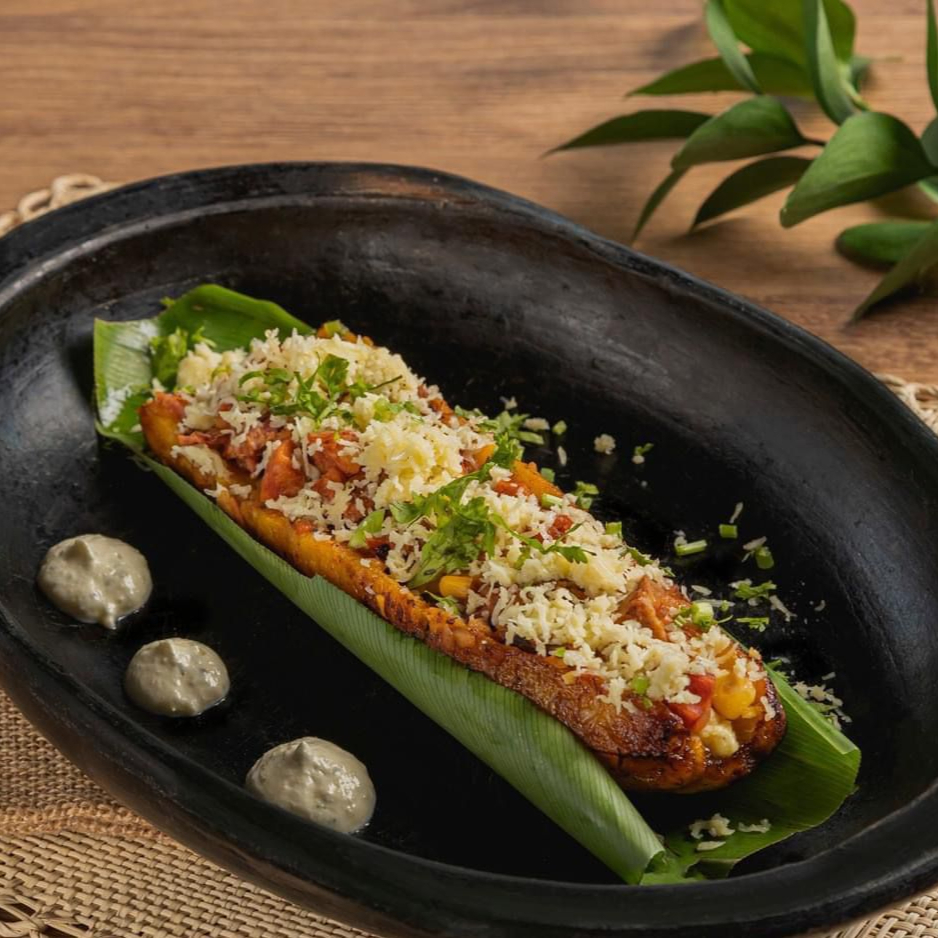Maduro entero freído con chorizo al carbón + toppings y salsas de tu elección sin límites