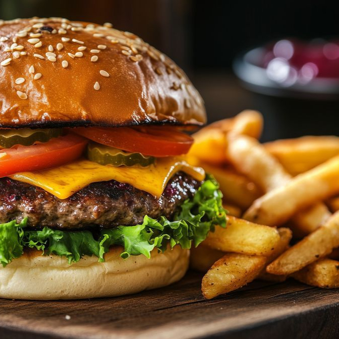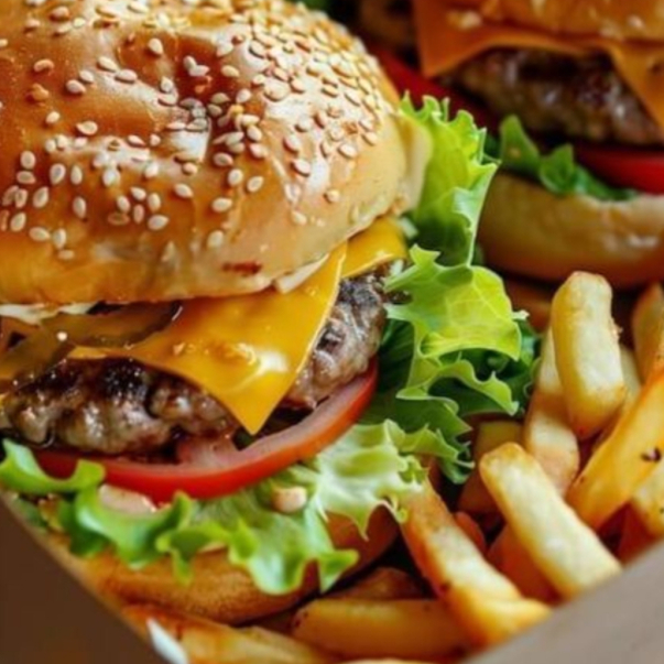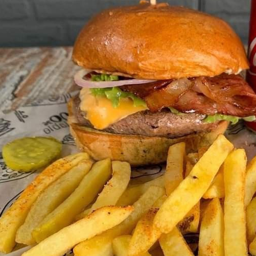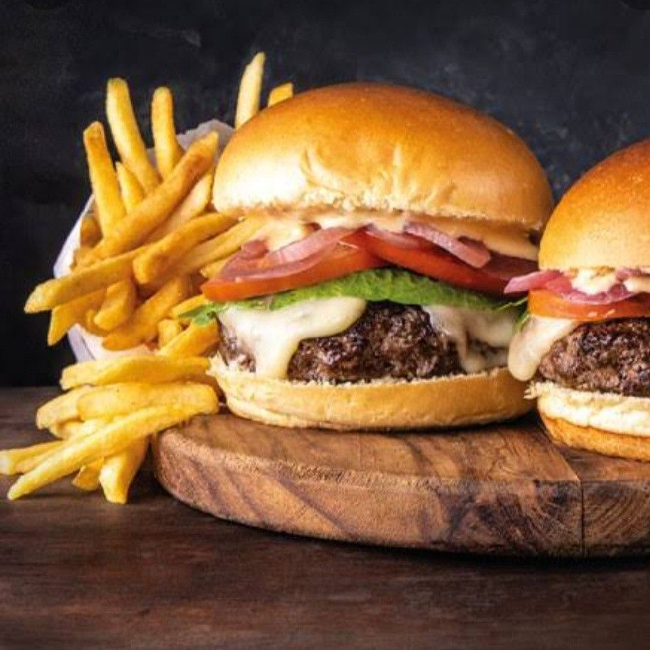 130 gr de carne , queso , vegetales frescos (tomate,cebolla),pepinillos, salsa de la casa +porcion de papas
