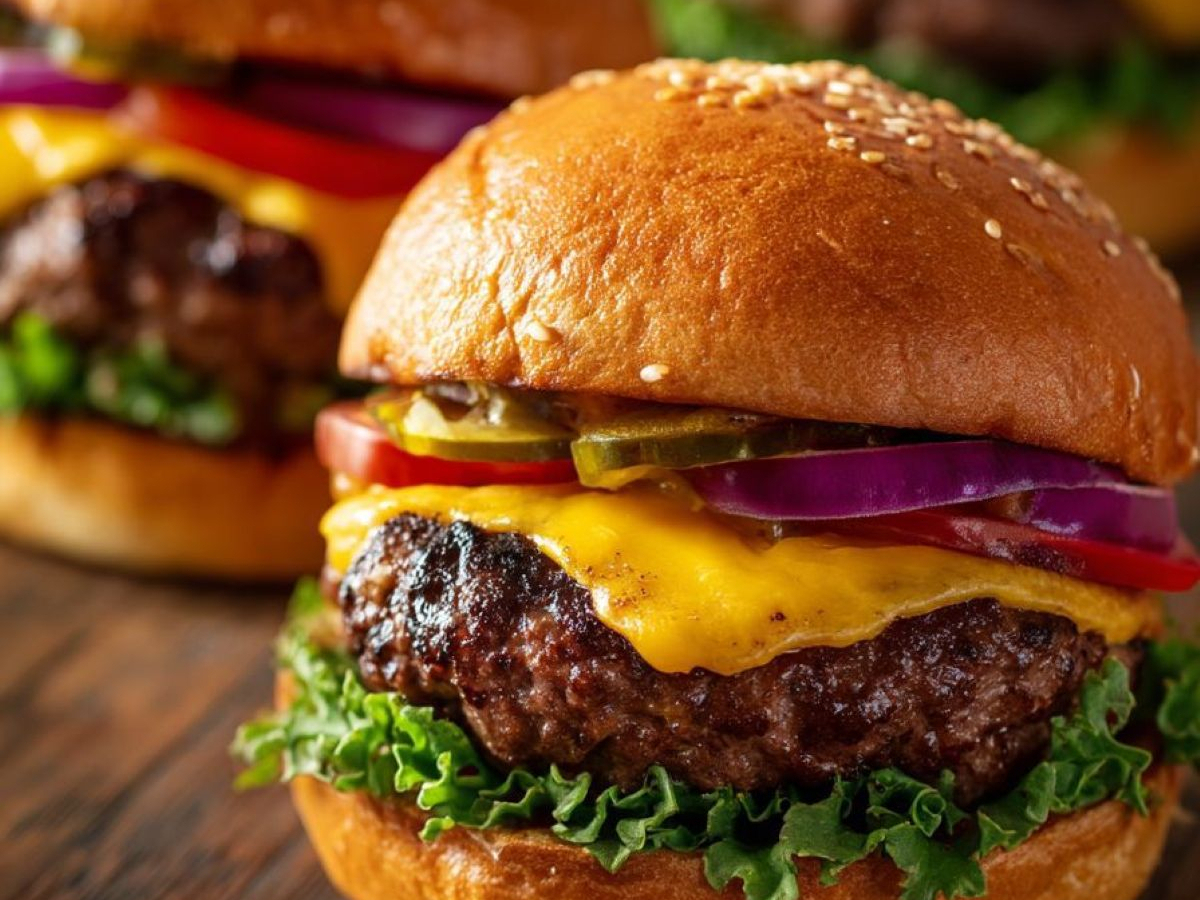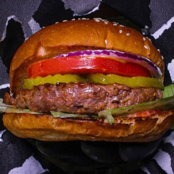 130 gr de carne ,queso ,vegetales frescos (tomate y cebolla) ,pepinillos y salsas de la casa