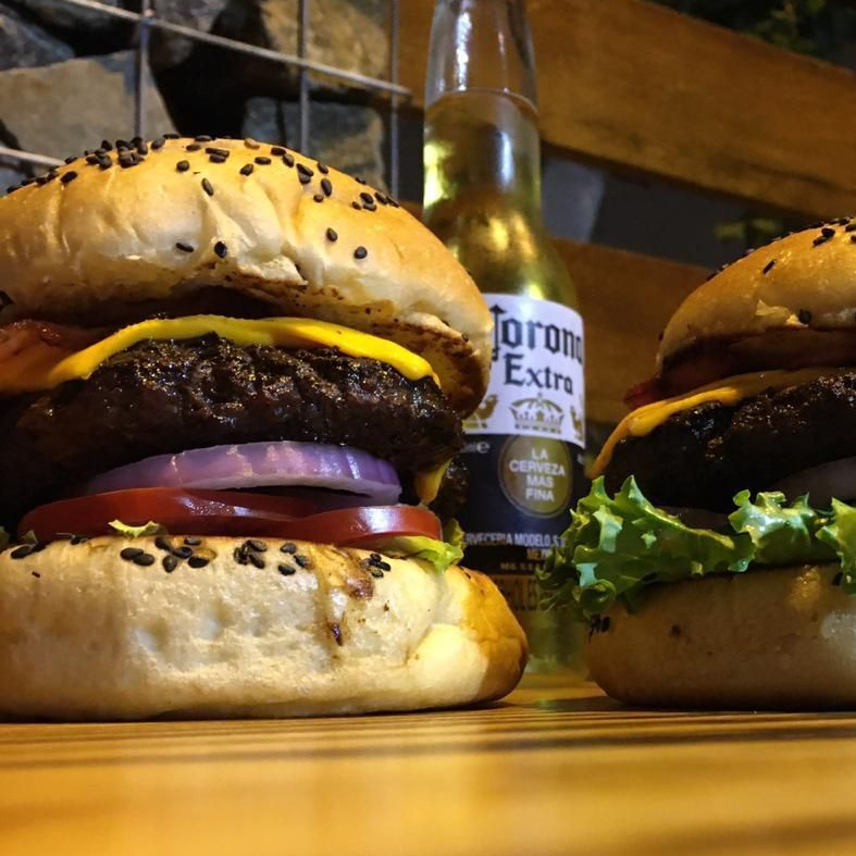 130 gr Carne, tocineta, queso, , vegetales frescos (cebolla y tomate) pepinillos y salsa de la casa