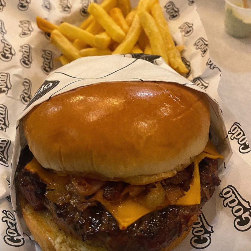 130 gr Carne, mermelada de chorizo, queso, , vegetales frescos (cebolla y tomate) pepinillos y salsa de la casa+ porcion de papas