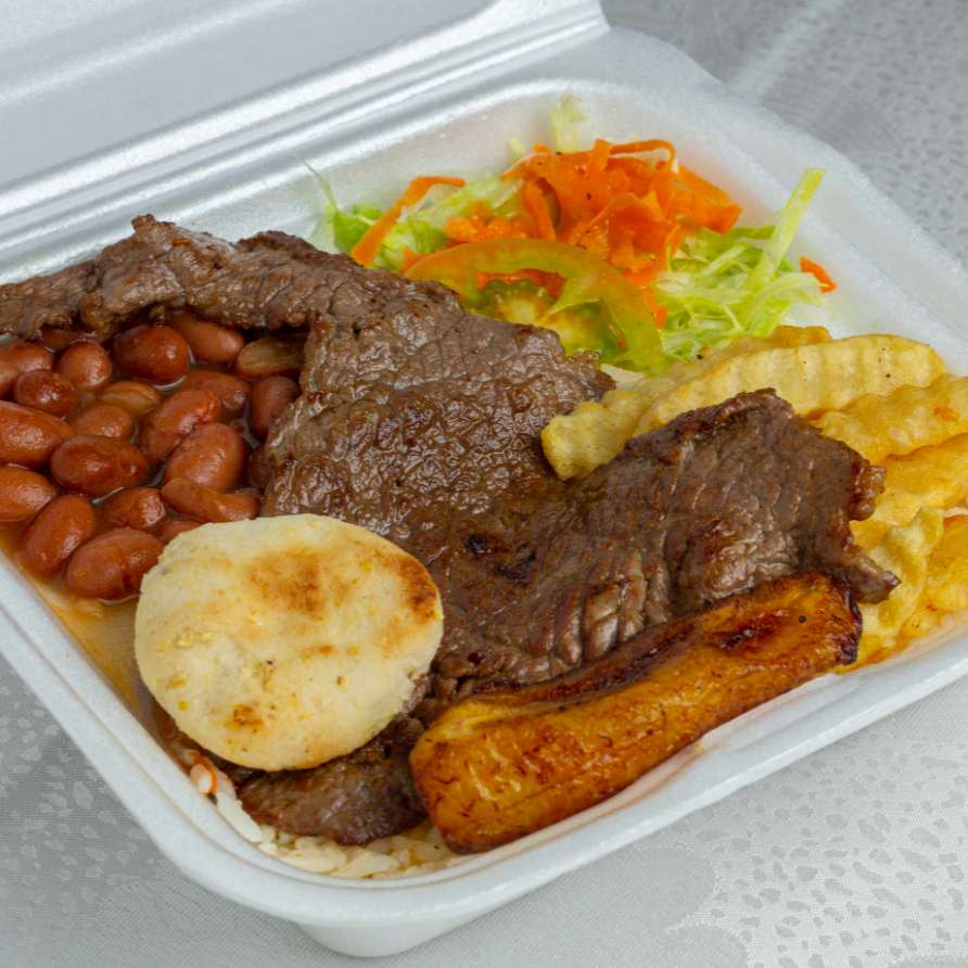 Arroz, frijol, carne molida, aguacate, chicharrón, chorizo, arepa, huevo frito y tajadas y limonada.
