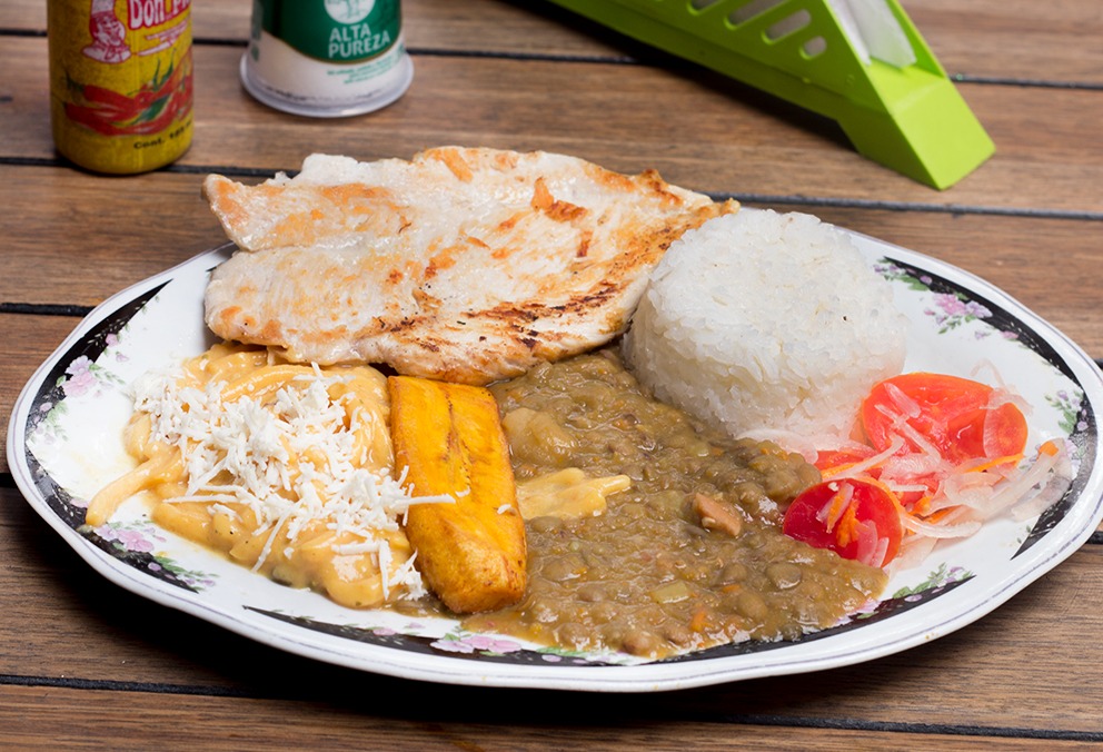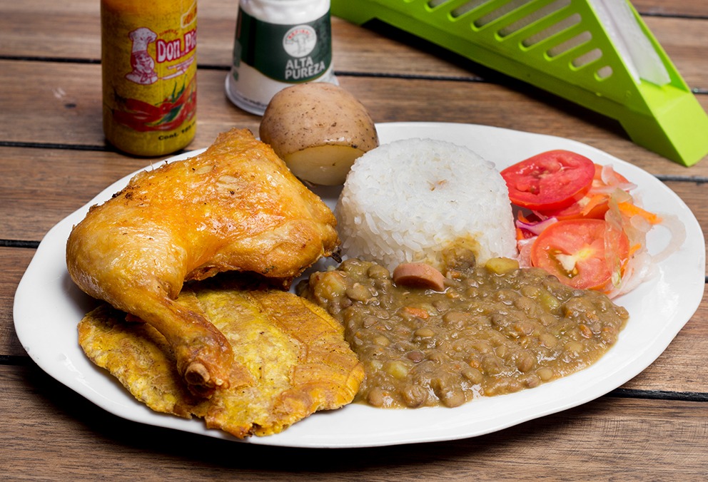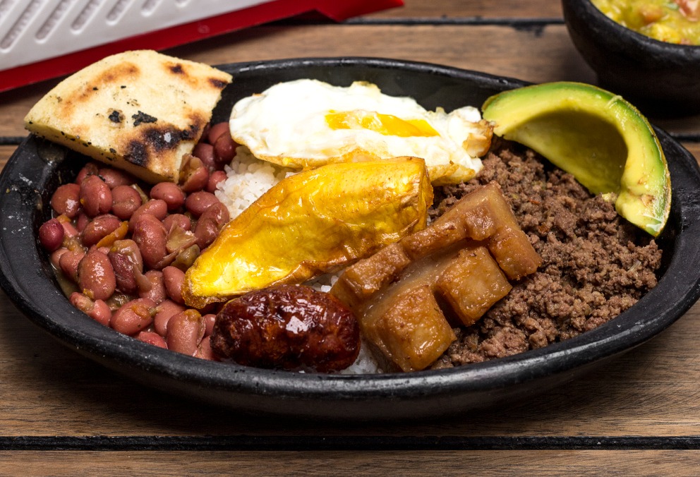 Arroz, frijol, carne molida, aguacate, chicharrón, chorizo, arepa, huevo frito, tajadas y limonada.