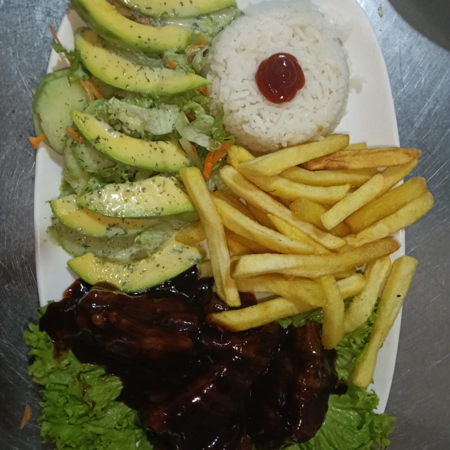 250 gra de costilla de cerdo en bbq, arroz, francesa y ensalada