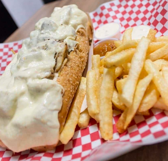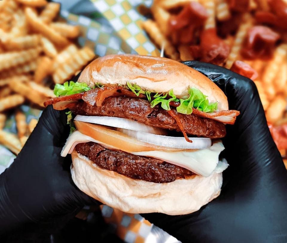 Pan brioche artesanal, doble carne, pollo desmechado con queso, jamón, queso + porción de papas a la francesa con chorizo y queso rayado.