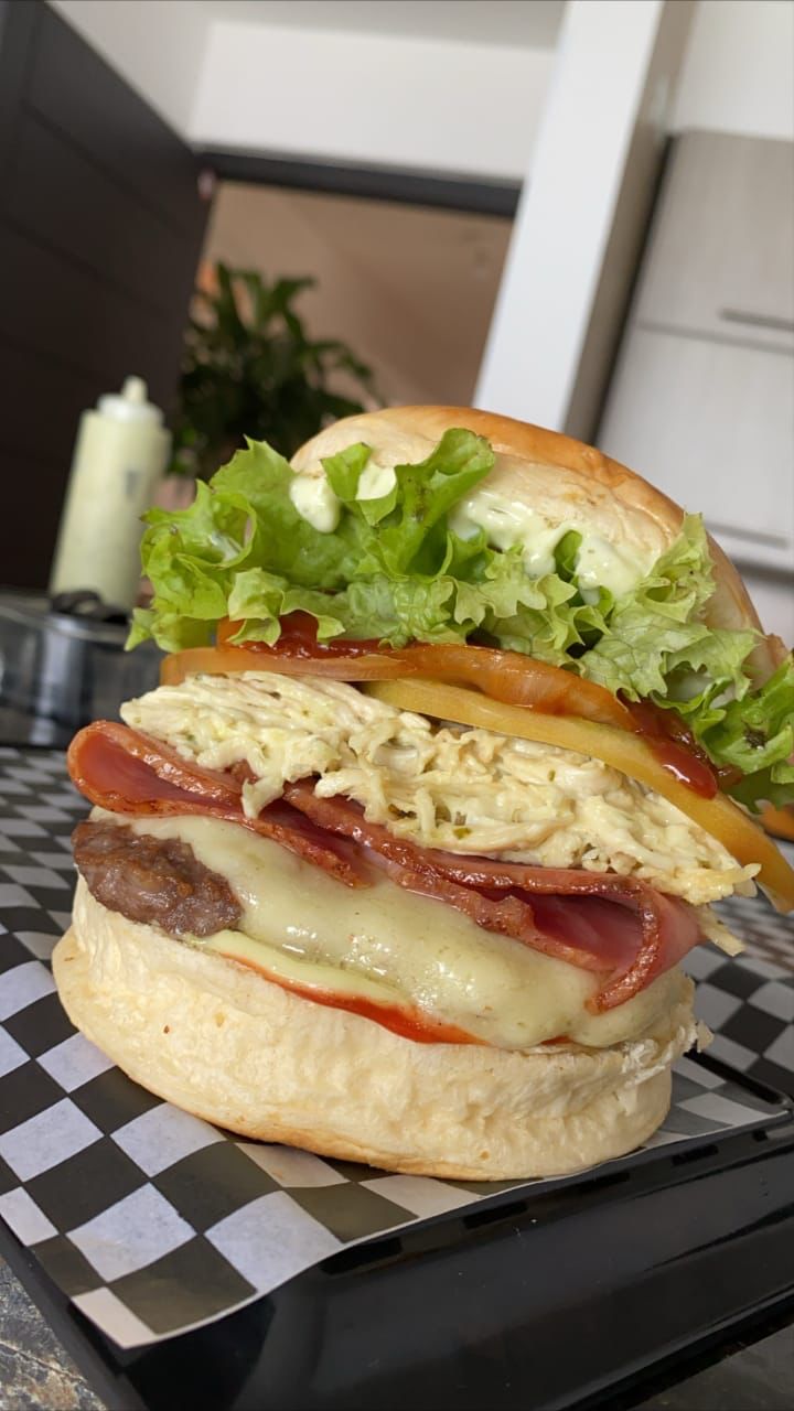 Pan brioche artesanal, carne de res, pollo desmechado, doble jamón, doble queso, lechuga, cebolla, tomate, salsas + porción de papas fritas.