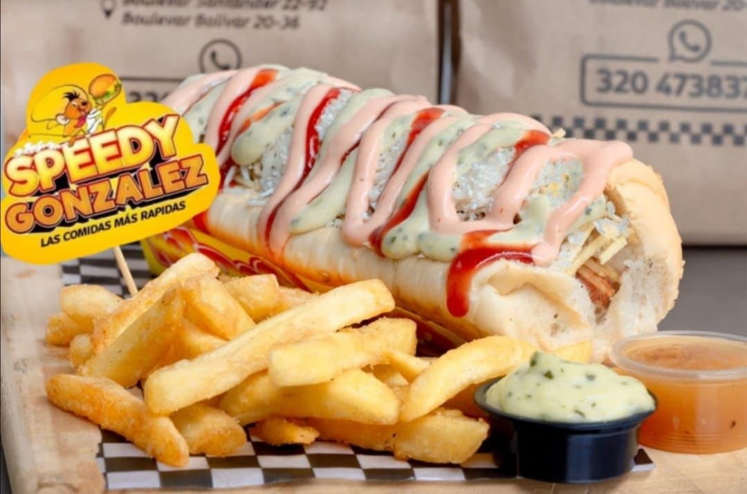 Pan brioche artesanal, salchicha zenú, papas fritas, queso rayado, salsas + porción de papas fritas.