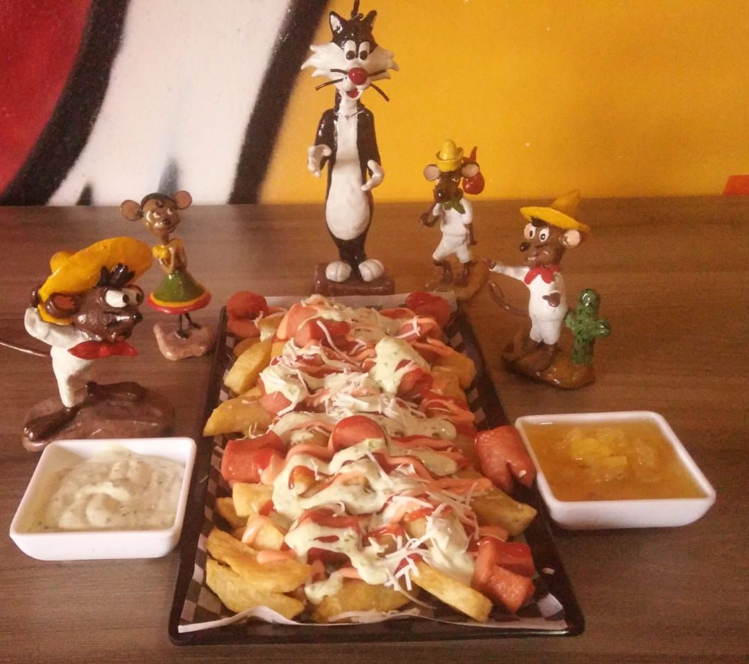 Chorizo, pollo desmechado, papas fritas, queso fundido y salsas.