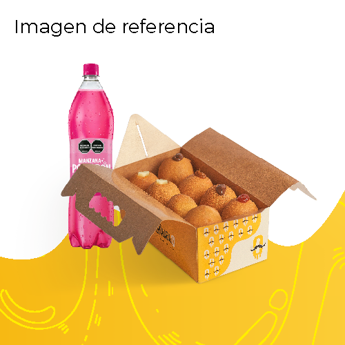 30 mini buñuelos con 4 toppings a tu elección + gaseosa Manzana Postobon 1.5l La caja perfecta para compartir ¿o no?
