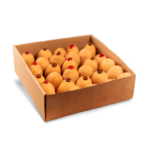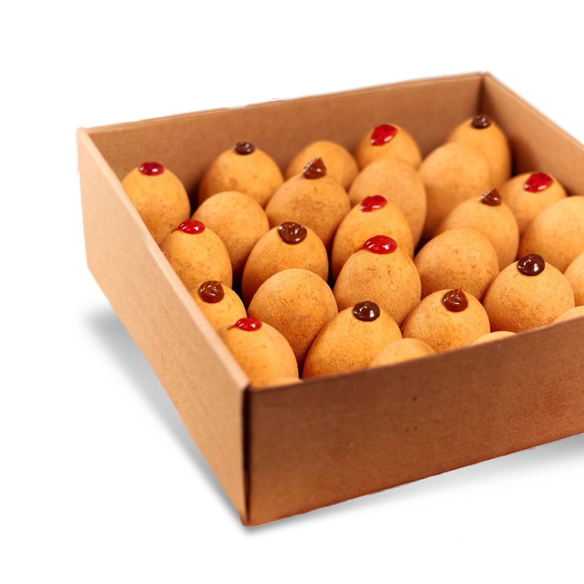 Crujientes por fuera y suaves por dentro: 30 mini buñuelos con 4 toppings a tu elección. La caja perfecta para compartir ¿o no?