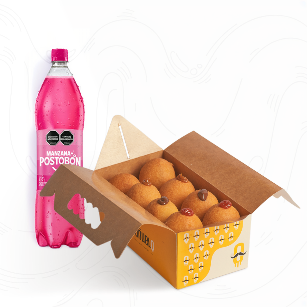 8 Buñuelos crujientes y recién hechos(2 tradicionales, 2 de queso mozzarella y 4 rellenos a tu gusto) + 1L Gaseosa Manzana Postobon. ¡un match delicioso para compartir! .
