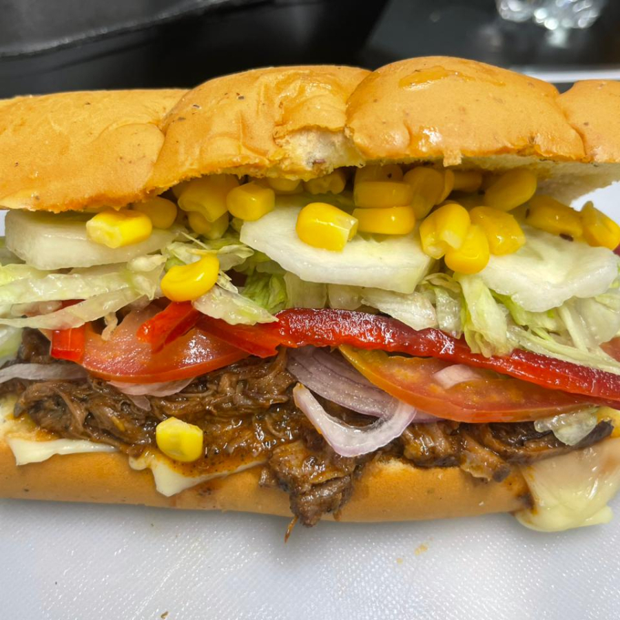 Pan de orégano, pulpa de cerdo desmechada bañada en salsa BBQ, queso mozzarella, tocineta, vegetales frescos (cebolla, tomate, pimentón, lechuga, pepinillos, jalapeños) salsas.