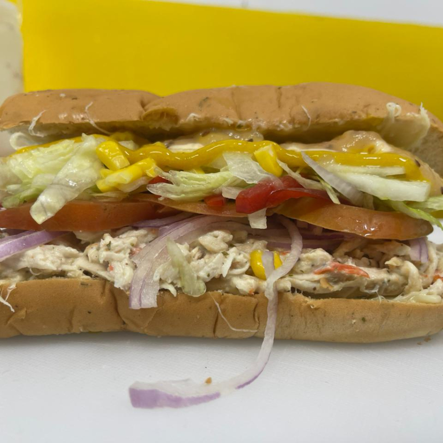 Pan de orégano, jamón de pavo o de cerdo, queso mozzarella, vegetales frescos (cebolla, tomate, pimentón, lechuga, pepinillos, jalapeños) salsas.