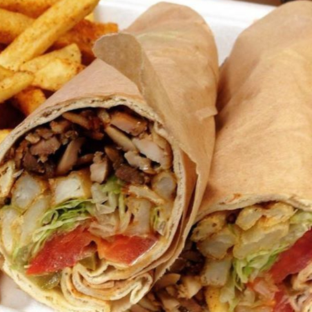 2 Shawarma, Mix de Trozos de Carne o Pollo, jamón ahumado, verduras frescas, papitas, queso rallado, salsas de la casa.