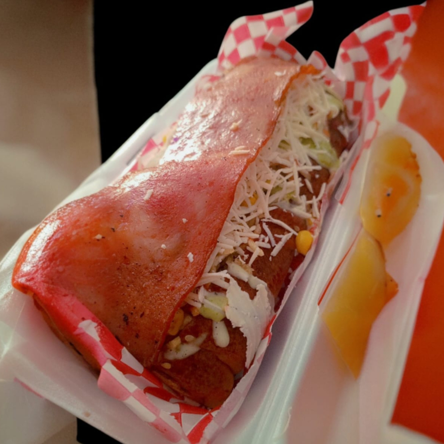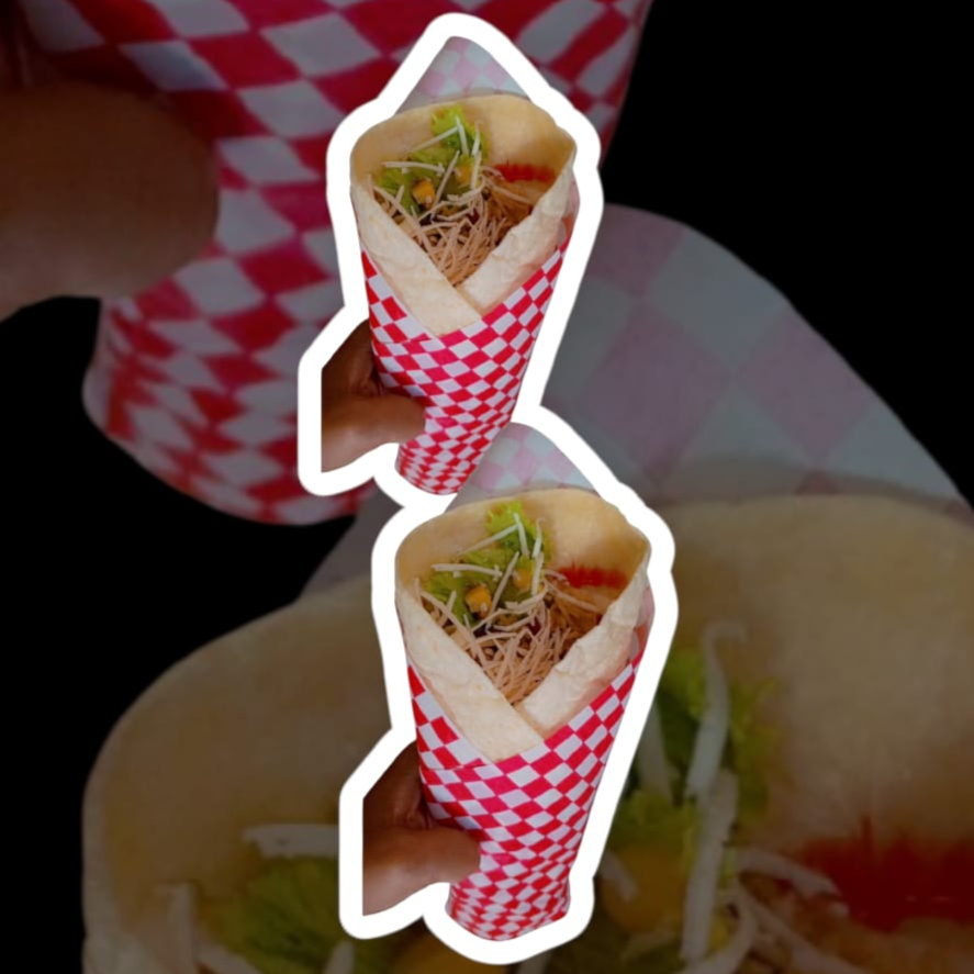 Pan Shawarma, Pollo Crispy, Jamón ahumado, Queso Rallado, Tocineta, maíz, Verduras Frescas, Papitas Cabello de Ángel, Salsas de la Casa