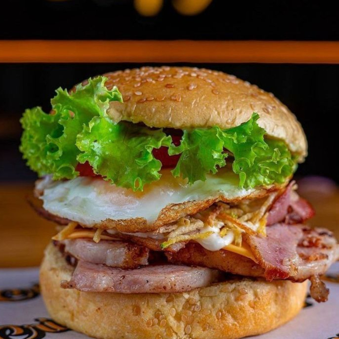 Pan Brioche, Doble Carne, Jamón Ahumado, Queso Americano, verduras frescas, Cebolla Grille, Papitas Cabello de Ángel, Huevo, Tocineta y Salsas de la casa acompañada de Papas a la Francesa (combinadas)