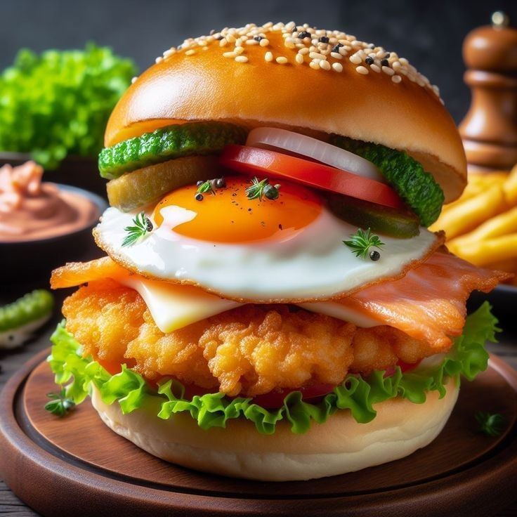 Pan Brioche, Pollo Crispy, Jamón Ahumado, Queso Americano, verduras frescas, Cebolla Grille, Papitas Cabello de Angel, Huevo, Tocineta, Maíz y Salsas de la casa acompañada de Papas a la Francesa (combinadas)